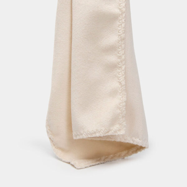 This fabric presents a pristine, creamy white appearance with a distinctive textural difference between its faces. The front side features a dense, soft Single-Sided Fleece pile that is uniform in height, offering a smooth, velvety tactile experience. The plush surface effectively diffuses light, creating a matte, non-reflective finish. The reverse side reveals a tight, flat knit structure, providing stability and structural integrity to the material. Weighing 355 g/m², the fabric is thick, opaque, and drapes heavily, making it resistant to wrinkling and ideal for substantial textile applications.
