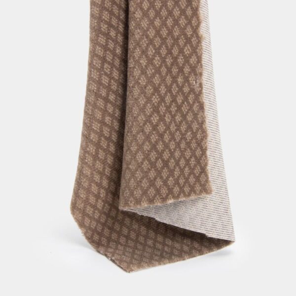 The fabric showcases a contemporary taupe-brown hue that offers a warm, neutral foundation for any interior design. Its standout feature is the embossed diamond rhombus pattern, which creates a stunning 3D micro-texture across the surface. This structured geometric weave adds depth and visual interest, while the plush velvet finish provides a soft, matte luster that elegantly reflects ambient lighting. The reverse side features a stable, reinforced knit base, ensuring the fabric remains taut and easy to work with during the upholstery process.
